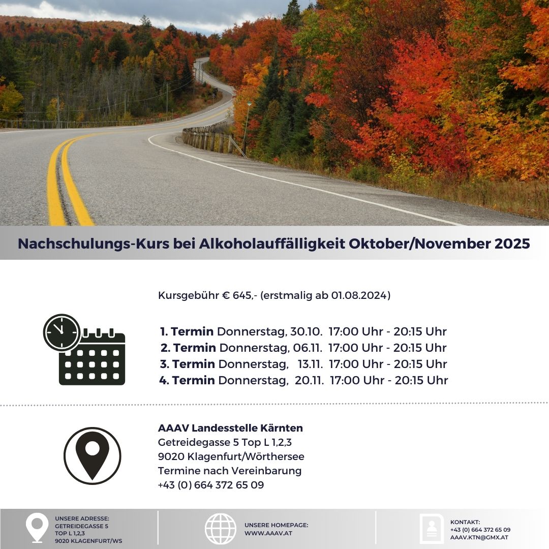 Benötigen Sie verkehrspsychologische Maßnahmen, um Ihre Fahreignung zu verbessern oder wiederherzustellen, rufen Sie uns für nähere Informationen und Termine an unter +43 (0) 664 372 65 09 oder schreiben Sie eine Email an ls.ktn@aaav.at.